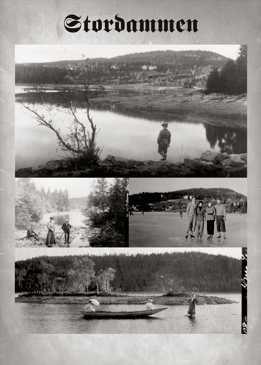 Fotomontasje over gamle bilder fra Stordammen. Du finner montasjebildene som enkeltbilder med beskrivelse ved å søke på Stordammen..
