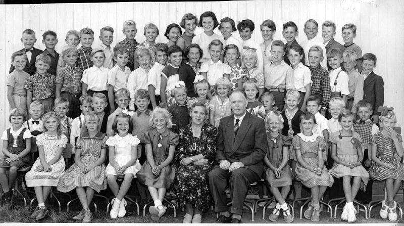 Bildet er tatt i 1955. 1. rekke fra venstre: Grete Emberland, Gerd Johansen, Birgit Johnsrud, Torill Larsen, Toril Anderson, lærer Margit Brattås, lærer Andreas Ertzeid, Liv Anderson, Inger Karin Johansen, Klara Langvasbråten og Tone Horgen. 2. rekke: Kåre Gustavsen, Johnny Kortvedt, Tor Bjørnerud, Ivar Tjugum, Arve Hoven, Per Heggbom, Liv Kristiansen, Gerd Karlsen, Evy Steen, Eva Kristiansen, Anne Fjære, Arve Syvertsen, Knut Lehn, Kåre Edmund Kristiansen og gutt ukjent. 3. rekke: Rudolf Johnsen, Åge Johan Ramsfjell, Svein Bjørnerud, John Johnsrud, Knut Engeland, Kjell Jan Gustavsen, Arild Johansen, Astrid Grøtterud, Betty Lübeck, Randi Hansen, Britt Fjære, Ingeborg Kortvedt, Terje Hindhamar, Harald Bråthen, Kristian Tjugum, Håkon Breda Ruud, gutt ukjent og Anders Espedokken. 4. rekke: Svein O. Steen, Vidar Sundberg, Dag Bomann, Terje Sandbeck, Oddvar Johansen, Tore Hoven, Berit Danielsen, Jorunn Johnsen, Astrid Bråthen, Svanhild Sandbeck, Inger Lise Hansen, Turid Kjellevold, Eli Karin Horgen, Oddvar Hansen, Jan Hagen, Asbjørn Tørvi og Einar Johansen. Se artikkel i Historielagsnytt nr. 1 side 11 fra 2006.