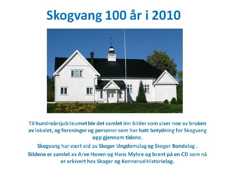Samling av bilder gjort til Skogvangs 100-årsjubileum i 2010. Samlingen er foretatt av blant annet Arve Hoven og Hans Myhre. Sistnevnte brant bildefilene til en CD som nå er i Skoger og Konnerud historielags arkiv.