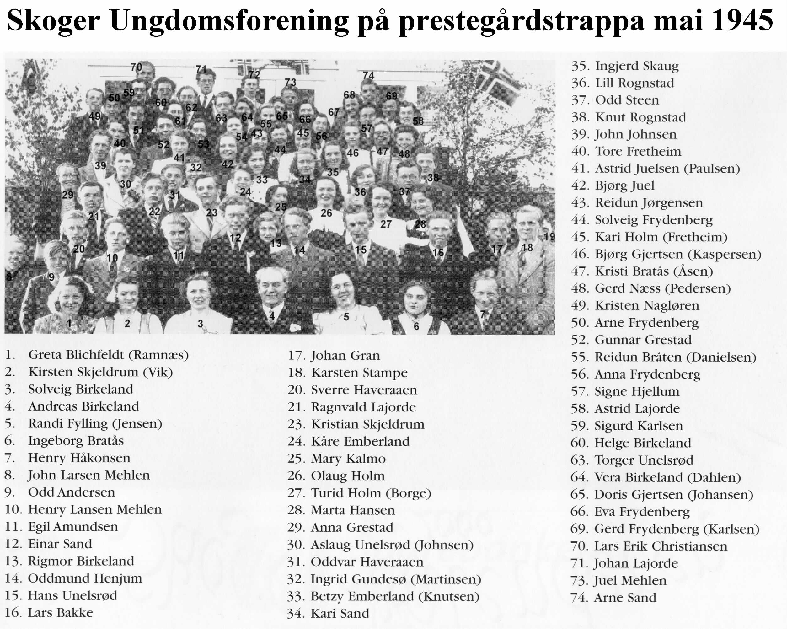 Bildet er utlånt fra Odd Steen som også har fremskaffet navn på personene. Skoger Ungdomslag på havetrappen i Skoger Prestegård i mai 1945 Skoger Ungdomslag måtte under krigen 1940 - 45 innstille lagsvirksomheten og sogneprest Birkeland og frue Solveig med barna Helge, Vera og Rigmor åpnet sitt hjem i prestegården for ungdommen i bygda. Samlingene i Prestegården gikk under navnet Skoger Ungdomsforening uten medlemsskap og organisert virksomhet. Mange hyggelige og gode minner knytter seg til ungdomsmøtene i Prestegården med den sang- og musikkglade prestefamilien som vertesskap. Personer på bildet (se orginalbildet for bedre bildeoppløsning): 1 Greta Blichfeldt (Ramnæs) 2 Kirsten Skjeldrum (Vik) 3 Solveig Birkeland 4 Andreas Birkeland 5 Randi Fylling (Jensen) 6 Ingeborg Bratås 7 Henry Håkonsen 8 Jonn Larsen Mehlen 9 Odd Andersen 10 Henry Larsen Mehlen 11 Egil Andersen 12 Einar Sand 13 Rigmor Birkeland 14 Oddmund Henjum 15 Hans Unelsrød 16 Lars Bakke 17 Johan Gran 18 Karsten Stampe 20 Sverre Haveraaen 21 Ragnvald Lajorde 23 Krstian Skjeldrum 24 Kåre Emberland 25 Mary Kalmo 26 Olaug Holm 27 Turid Holm (Borge) 28 Marta Hansen 29 Anna Grestad 30 Aslaug Unelsrød (Johnsen) 31 Oddvar Haveraaen 32 Ingrid Gundesø (Martinsen) 33 Betzy Emberland (Knutsen) 34 Kari Sand 35 Ingjerd Skaug 36 Lill Rognstad 37 Odd Steen 38 Knut Rognstad 39 John Johnsen 40 Tore Fretheim 41 Astrid Juelsen (Paulsen) 42 Bjørg Juel 43 Reidun Jørgensen 44 Solveig Frydenberg 45 Kari Holm (Fretheim) 46 Bjørg Gjertsen (Kaspersen) 47 Kristi Bratås (Åsen) 48 Gerd Næss (Pedersen) 49 Kristen Nagløren 50 Arne Frydenberg 52 Gunnar Grestad 55 Reidun Bråten (Danielsen) 56 Anna Frydenberg 57 Signe Hjellum 58 Astrid Lajorde 59 Sigurd Karlsen 60 Helge Birkeland 63 Torger Unelsrød 64 Vera Birkeland (Dahlen) 65 Doris Gjertsen (Johansen) 66 Eva Frydenberg 69 Gerd Frydenberg (Karlsen) 70 Lars Erik Christiansen 71 Johan Lajorde 73 Juel Mehlen 74 Arne Sand