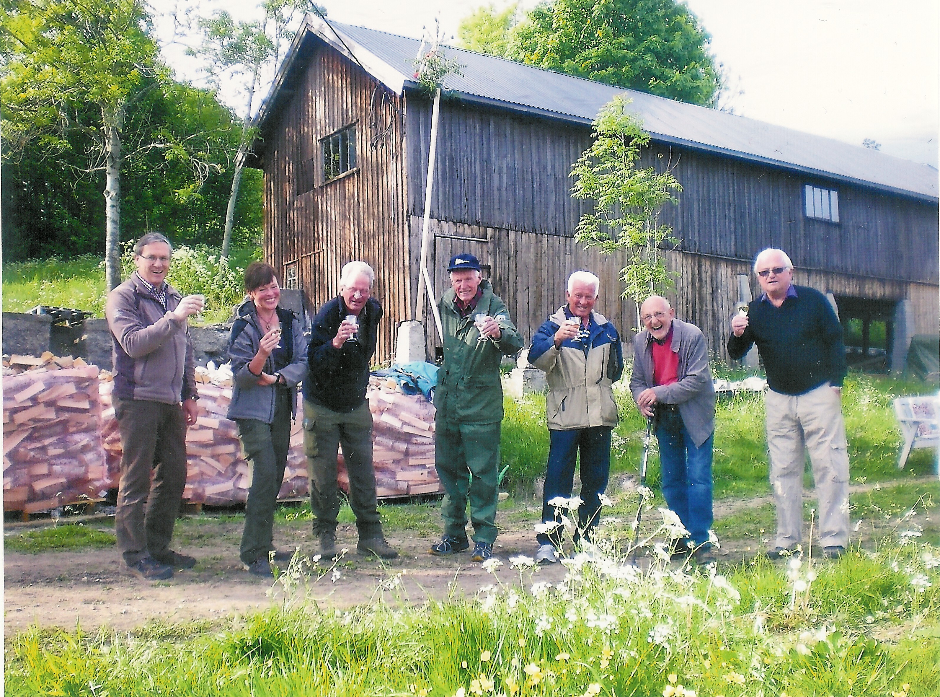 "Kranseskål" for nådd milepæl på Skjeldrumsaga - det er mulig å kjøre saga igjen. Fra venstre: Arve Hoven, Linda Skjeldrum (eier av saga), Hans Myhre, Thor Jahren, Tom Hayden, Oscar Hauge og Øyvind Pedersen. Reidar Halden (som tok bildet) var prosjetleder for restaureringsprosjektet.