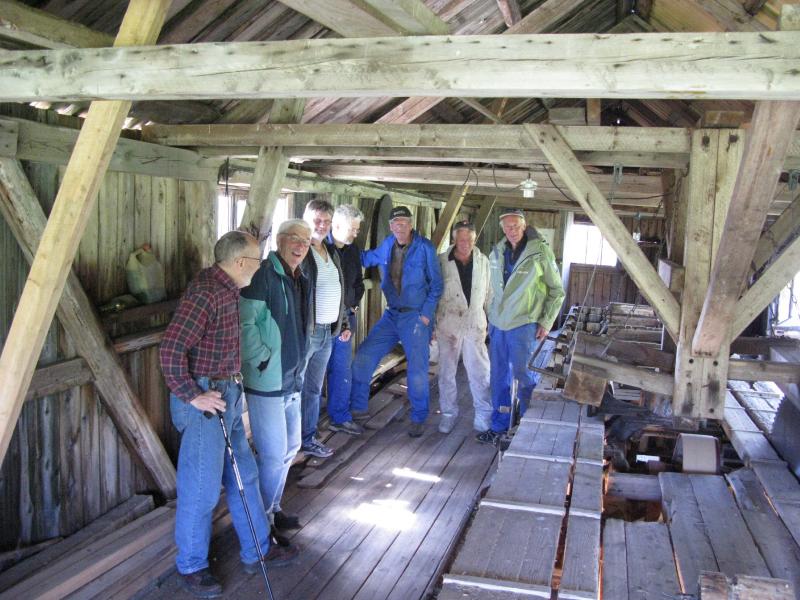 "Inspeksjon" av saga den dagen saga ble kjørt forsiktig i gang etter at det nye elektriske anlegget var ferdig installert. Fra venstre: Oscar Hauge, Reidar Halden, Kjell Borge Johnsen (ansvarlig elektriker), Willi Johansen, Hans Myhre, Tom Hayden, Thor Jahren.