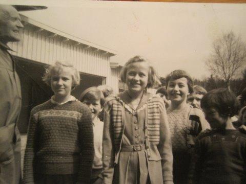 Lærer Broder Jordbræk : Oppstilling i skolegården etter "frikvarteret". Else Marie Kaspersen, Berit Berntsen, Inger Juel, Bak : Anita Kaspersen, Torill Aaserud, Gerda Tollefsen