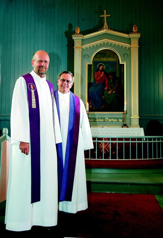 De to sogneprestene fra hvert sitt sogn i Skoger prestegjeld foran altertavla i Konnerud gamle kirke fra 1915 med Jesus og Nikodemus som motiv. Bjørn Vidar Lie (til venstre) og Finn Kristian Martinsen