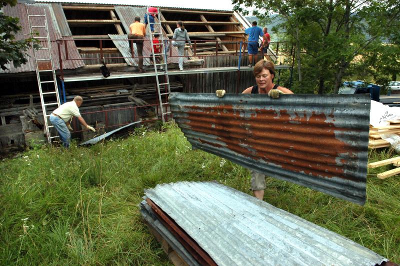 Restaurering av Skjeldrumsaga. I forgrunnen Linda Skjeldrum som jobber med takplatene. Linda Skjeldrum er eier av saga og gården den står på.
