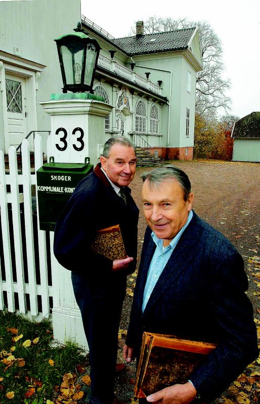 To tidligere herredsstyremedlemmer på vei inn til Austad Hovedgård hvor herredsstyremøtene ble holdt. Egil Eskerud foran og Alf Nordli. Er tilbake på gamle tomter (Austad Hovedgård) der herredsstyret i Skoger var samlet frem til des.1963