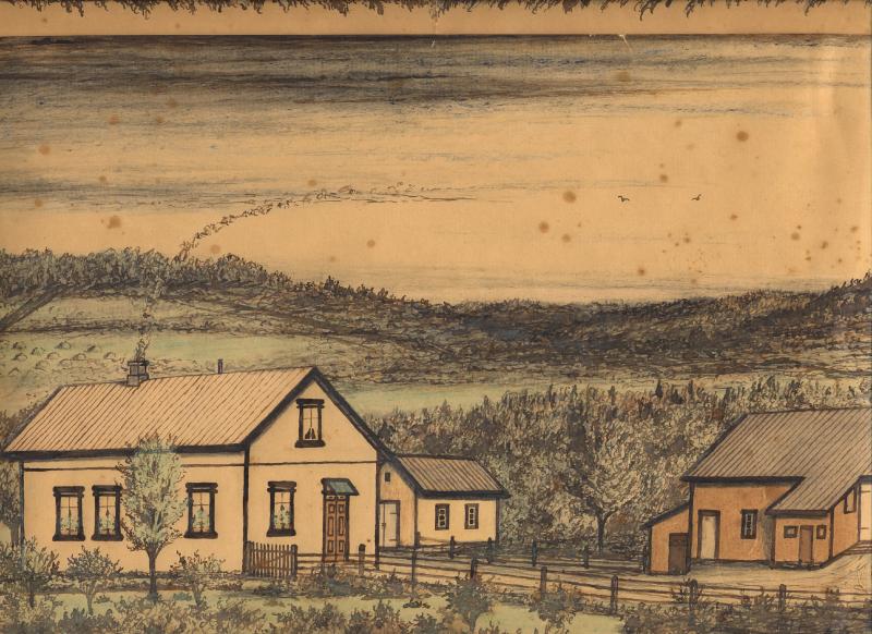 Foto av gammel tegning datert 1896 av gården Prydsrud (senere Prøis) Tegner er Ellef Olsen Ekholt.
