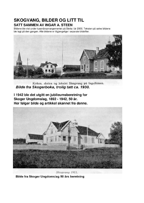 Samling av bilder gjort til Skogvangs 100-årsjubileum i 2010. Samlingen er foretatt av blant annet Arve Hoven og Hans Myhre. Arve brant bildefilene til en CD som nå er i Skoger og Konnerud historielags arkiv.