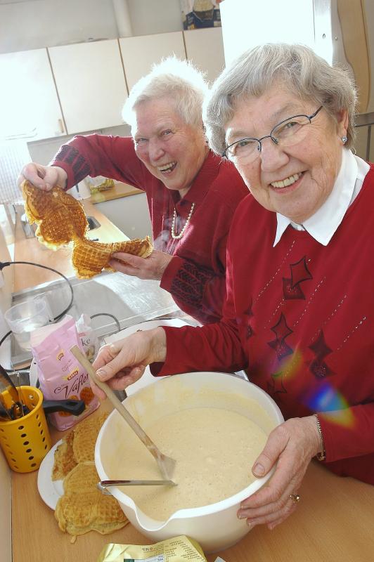 Karin Aas og Karen Sveen steker vafler på bingoen ved Konnerud Bo-og Servicesenter
