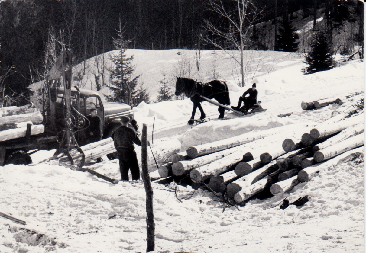 Olaf Sandum Kjører tømmer med "Svarten" innenfor Dammyr i Selvik Bruk i 1962 Reidar Kristoffersen ved lessekrana