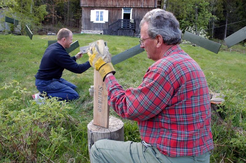 Hans Myhre f. 1939 nærmest og Stian Horgen f.1967 er igang med å restaurere og oppgradere informassjonsskiltene som historielaget har satt opp på et trettitalls plasser inne på Vestskogen. Dette er på Rønnehue.
