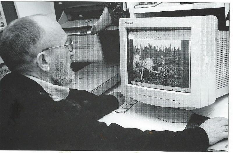 Oscar Hauge ved PC-en. ImageAXS Pro, programmet historielagets bilder er arkivert i, er på skjermen. Oscar er i full gang med skanning og registrering av bilder.