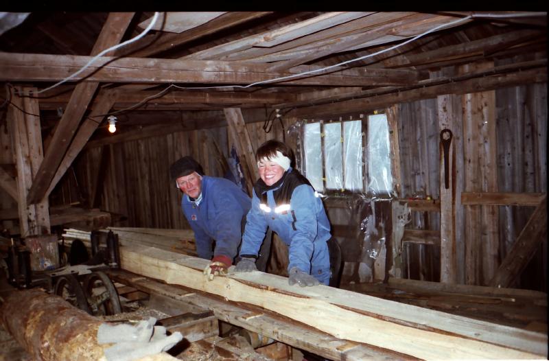Per Skjeldrum (som eide nabogården og var fetter av Jørgen Skjeldrum) og Linda Skjeldrum (datter av Jørgen Skjeldrum) mater den ene saglinja. Bildet er tatt den siste dagen det var ordinær drift på saga i 1998.