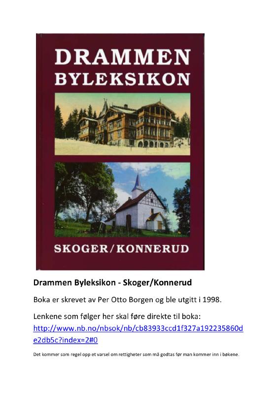 Boka er et leksikon for Skoger og Konnerud som tar for seg personer, gårder, steder, virksomheter m.m. Boka er skrevet av Per Otto Borgen og ble utgitt i 1998. Boka er skannet av Nasjonalbiblioteket og er lagret der. Her ligger kun ei PDF-fil med lenke til boka i Nasjonalbiblioteket. Veiledning: Klikk «Last ned» orginalfila. Et avlangt vindu kommer opp nederst på skjermen (i Windows 10), klikk «Åpne» og pdf-fila åpnes på egen maskin. Under forsidebildet ligger ei blå lenke, klikk på denne fører til åpning av boka i Nasjonalbiblioteket. Klikk «OK» på varselet om opphavsrettigheter og det er klart for å søke eller bla i boka.
