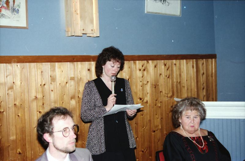 Bilde fra Skoger Ungdomslags markering av at laget har eksistert i 100 år med jubileumsfest på Skogvang 14. mars 1992. Varaordfører Lise Christoffersen hilser ungdomslaget.