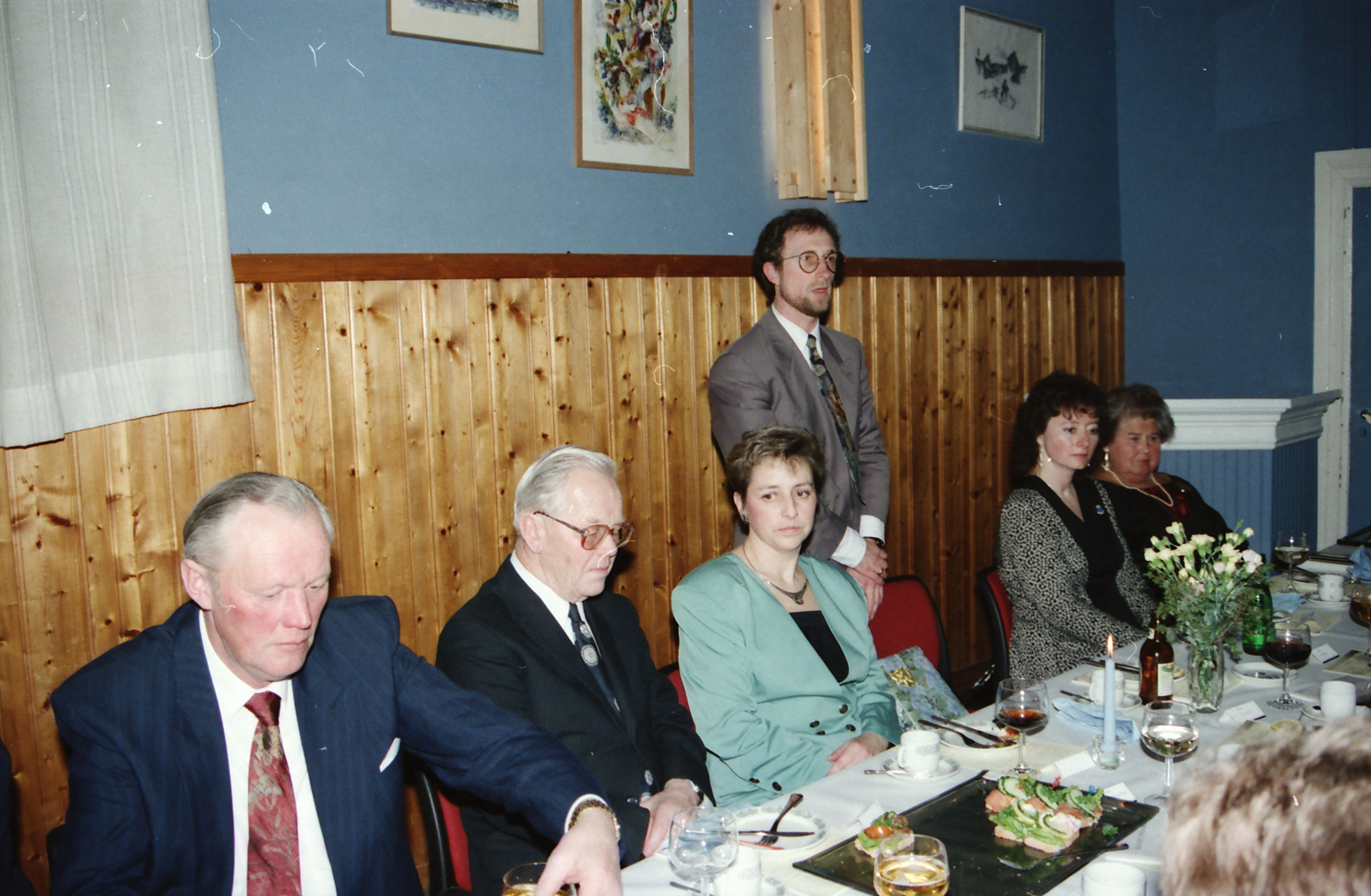 Bilde fra Skoger Ungdomslags markering av at laget har eksistert i 100 år med jubileumsfest på Skogvang 14. mars 1992. Representant fra kommunen (?) overbringer hilsen til laget. Fra v. Per Skjeldrum, Julius Gundesø, ukjent, ukjent taler, Lise Christoffersen, Aslaug Rypaas.