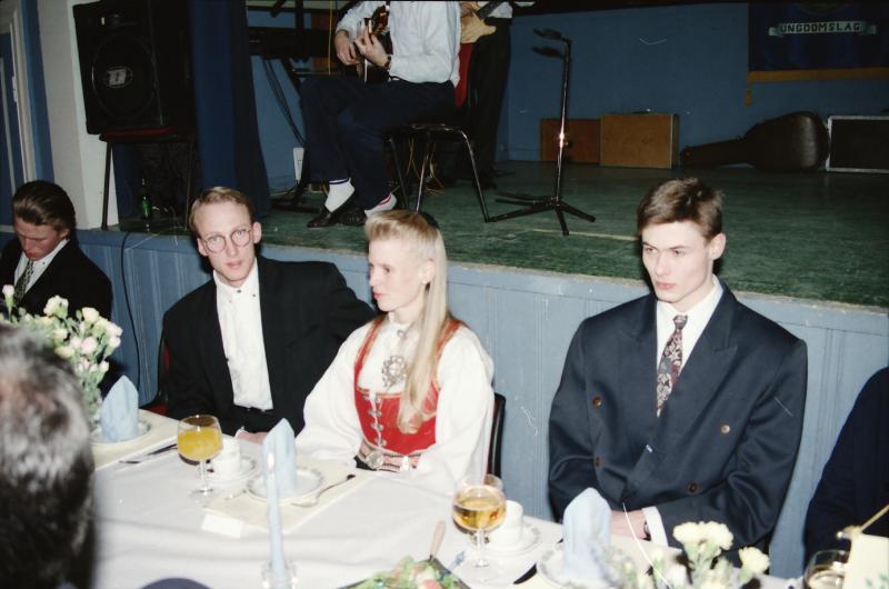 Bilde fra Skoger Ungdomslags markering av at laget har eksistert i 100 år med jubileumsfest på Skogvang 14. mars 1992. Medlemmer av styret, Hans Olav Steen, leder Kyrre Tørhaug, Marianne Steen og Thomas Juel.