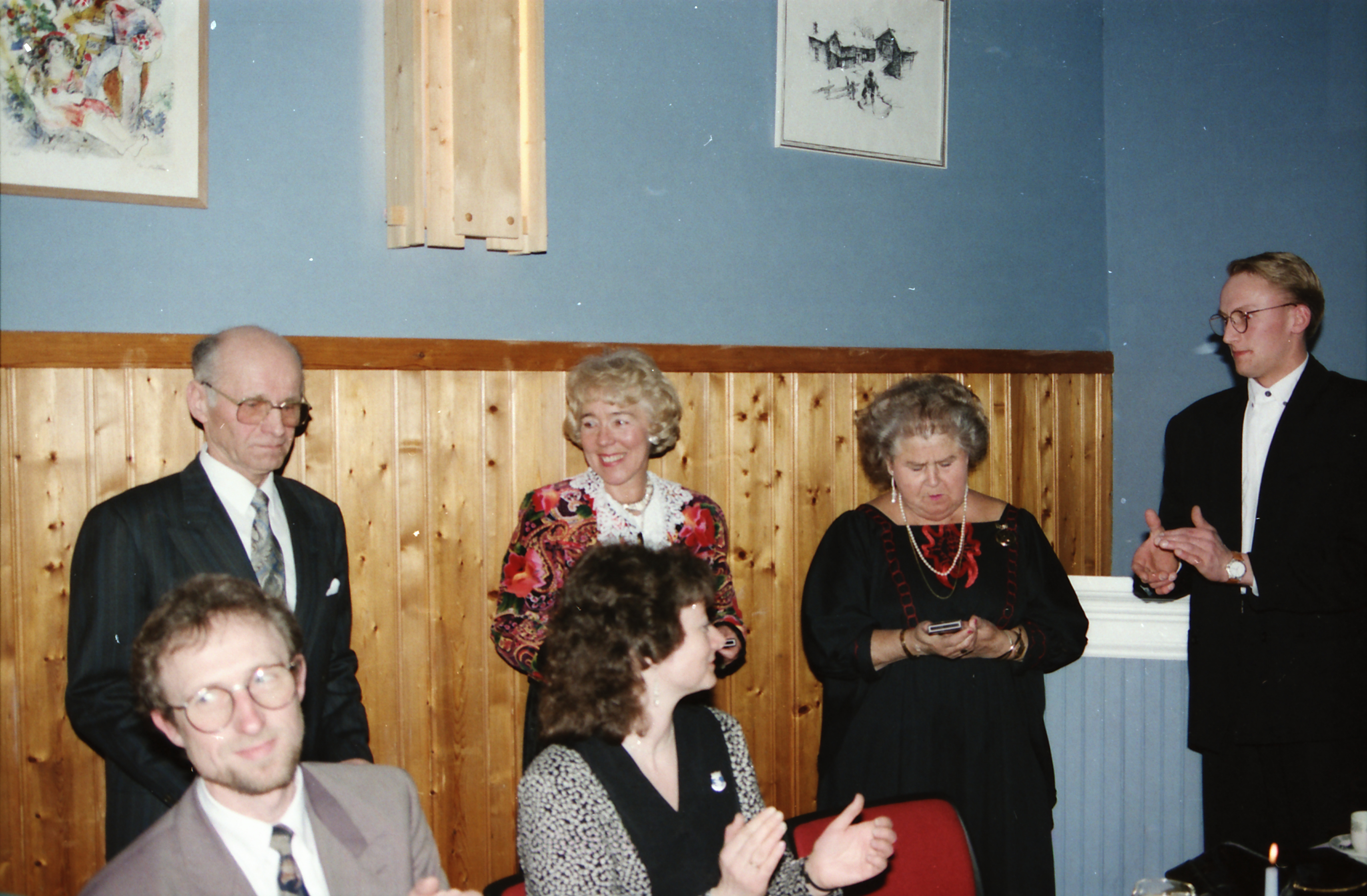 Bilde fra Skoger Ungdomslags markering av at laget har eksistert i 100 år med jubileumsfest på Skogvang 14. mars 1992. Odd Steen, Inger Hyllseth og Aslaug Rypaas blir hedret av formann Kyrre Tørhaug for stor innsats for laget.