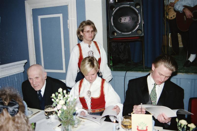 Bilde fra Skoger Ungdomslags markering av at laget har eksistert i 100 år med jubileumsfest på Skogvang 14. mars 1992. Hans Steen ble utnevnt til æresmedlem på festen. Fra v. Hans Steen, styremedlemmer Cicilie Bråthen, Anne Rese og Hans Olav Steen.