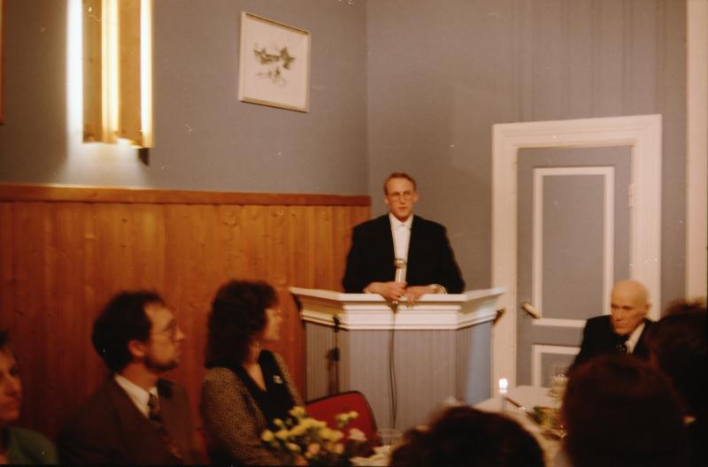 Bilde fra Skoger Ungdomslags markering av at laget har eksistert i 100 år med jubileumsfest på Skogvang 14. mars 1992. Formann i ungdomslaget, Kyrre Tørhaug, holder tale.
