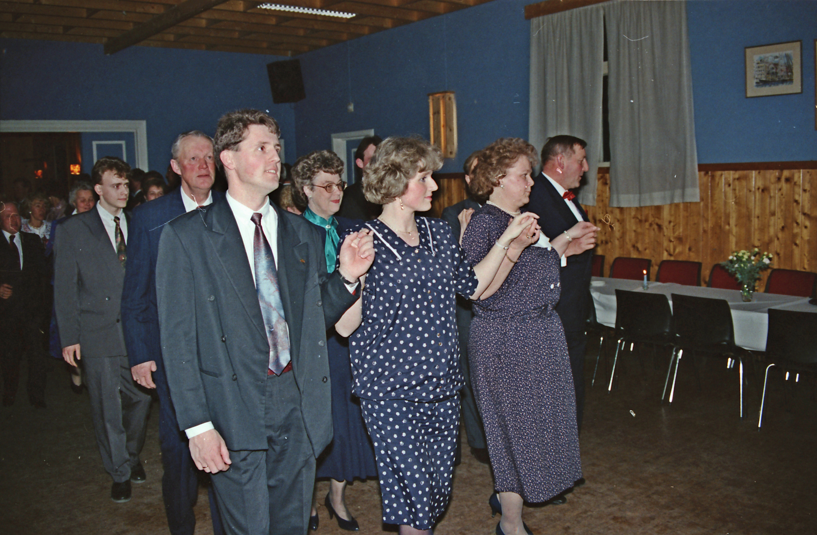 Bilde fra Skoger Ungdomslags markering av at laget har eksistert i 100 år med jubileumsfest på Skogvang 14. mars 1992. Polonesen er i gang. I første rekke Jon-Anders og Mona Hindhamar, pluss Aud og Erik Juel. I 2. rekke Per og Berit Skjeldrum. I 3. rekke Karl Magnus Knudsen.