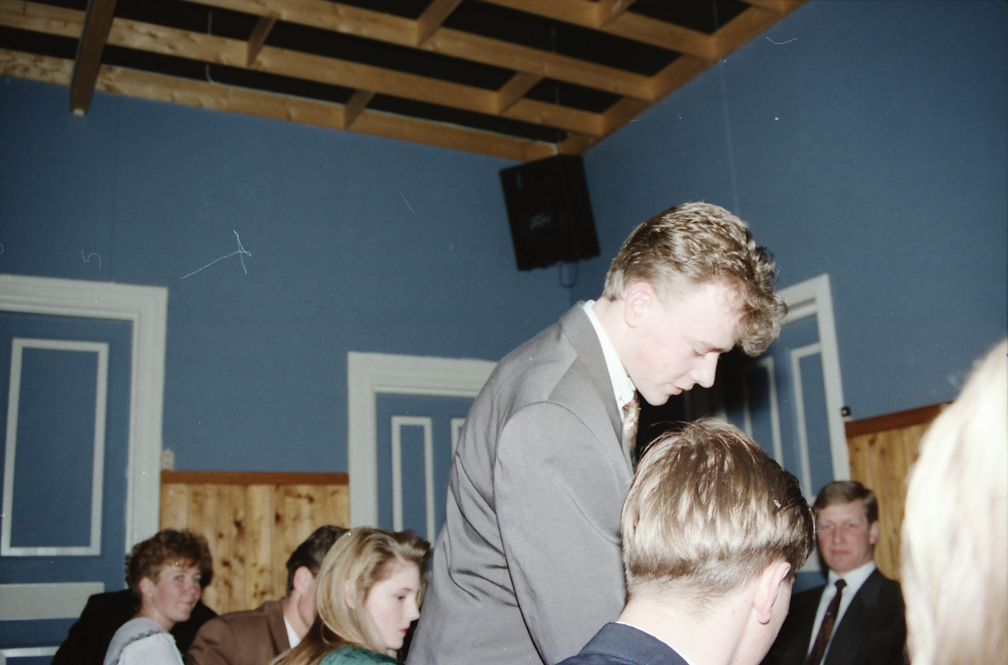 Bilde fra Skoger Ungdomslags markering av at laget har eksistert i 100 år med jubileumsfest på Skogvang 14. mars 1992. Fra v. Hilde Lehn, Christin Borge Johansen, Karl Magnus Knudsen (stående) og Knut Ole Røed.