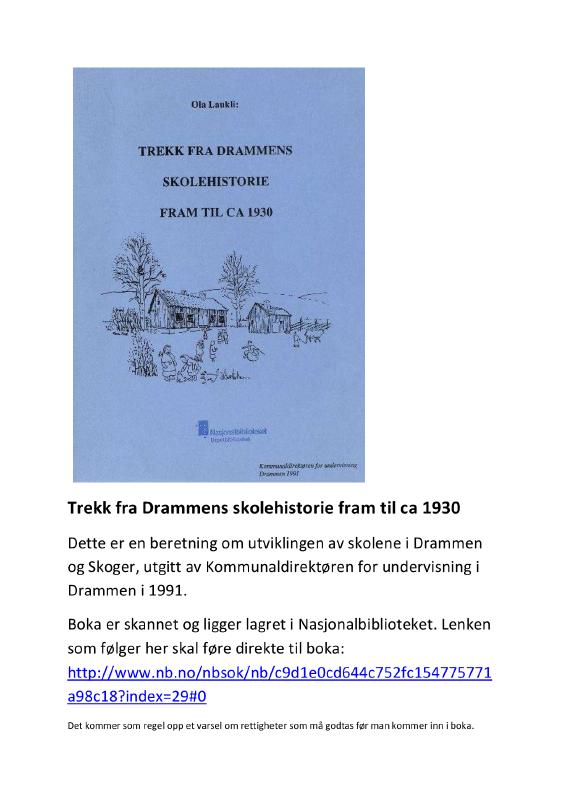 Beretning om utviklingen av skolene i Drammen og Skoger fram til ca. 1930. Boka er utgitt av Kommunaldirektøren for undervisning i Drammen, Ola Laukli, i 1991. Boka er skannet av Nasjonalbiblioteket og er lagret der. Her ligger kun ei PDF-fil med lenke til boka i Nasjonalbiblioteket. Veiledning: Klikk «Last ned» orginalfila. Et avlangt vindu kommer opp nederst på skjermen (i Windows 10), klikk «Åpne» og pdf-fila åpnes på egen maskin. Under forsidebildet ligger ei blå lenke, klikk på denne fører til åpning av boka i Nasjonalbiblioteket. Klikk «OK» på varselet om opphavsrettigheter og det er klart for å søke eller bla i boka.