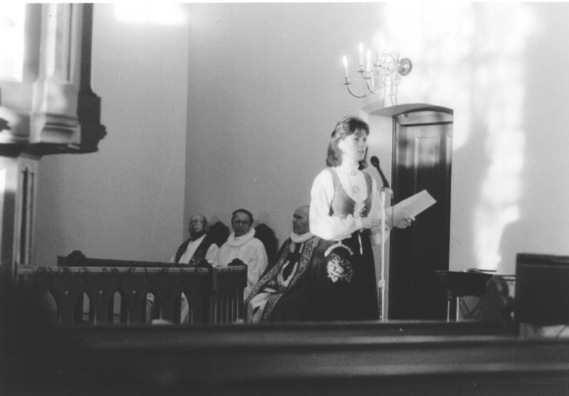 Jubileums-gudstjeneste i Skoger Kirke. Inger Johnsrud leser dagens tekst. Hun var klokker den gangen. Nr.2 fra venstre sitter kappelan Karl Frode Hilton.