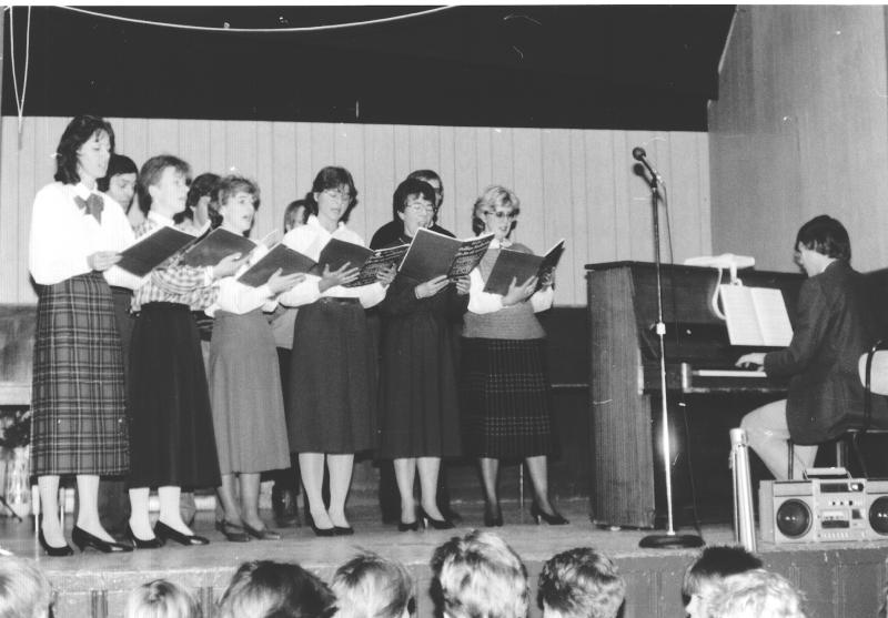 Sangkoret Chorisma sang under kulturkvelden 8.12.1985 på Skogvang i forbindelse med Skoger kirkes 100-års jubileum. På bildet ser vi: 1. rekke fra venstre: Inger Johnsrud, Hanne Skjeldrum Fretheim, Turid Skjeldrum Skatrud, Kjersti Myhre (?), Åse Marit Gundesø, Hedvig Røed Kaspersen. 2. rekke fra venstre: Rolf Madsen, NN, Per Magne Aasen, Arne Dahl Ved pianoet dirigent og organist Tor Johnstad