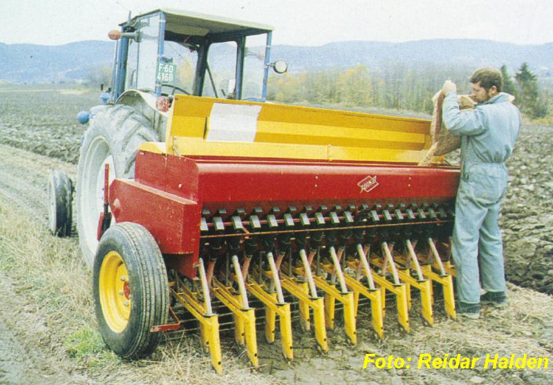 Harald Hindhamar fyller såkorn i kombimaskinen. Dette er en såmaskin med to såkasser og sett med sålabber. Gjødsel og såkorn sås samtidig og gjødsla legges i bestemt avstand og dybde i forhold til såkornet. Kombimaskinene kom på markedet omkring 1970. Bildet her ar tatt for bruk i Skoger Bondelags 100-årsberetning i 1985.