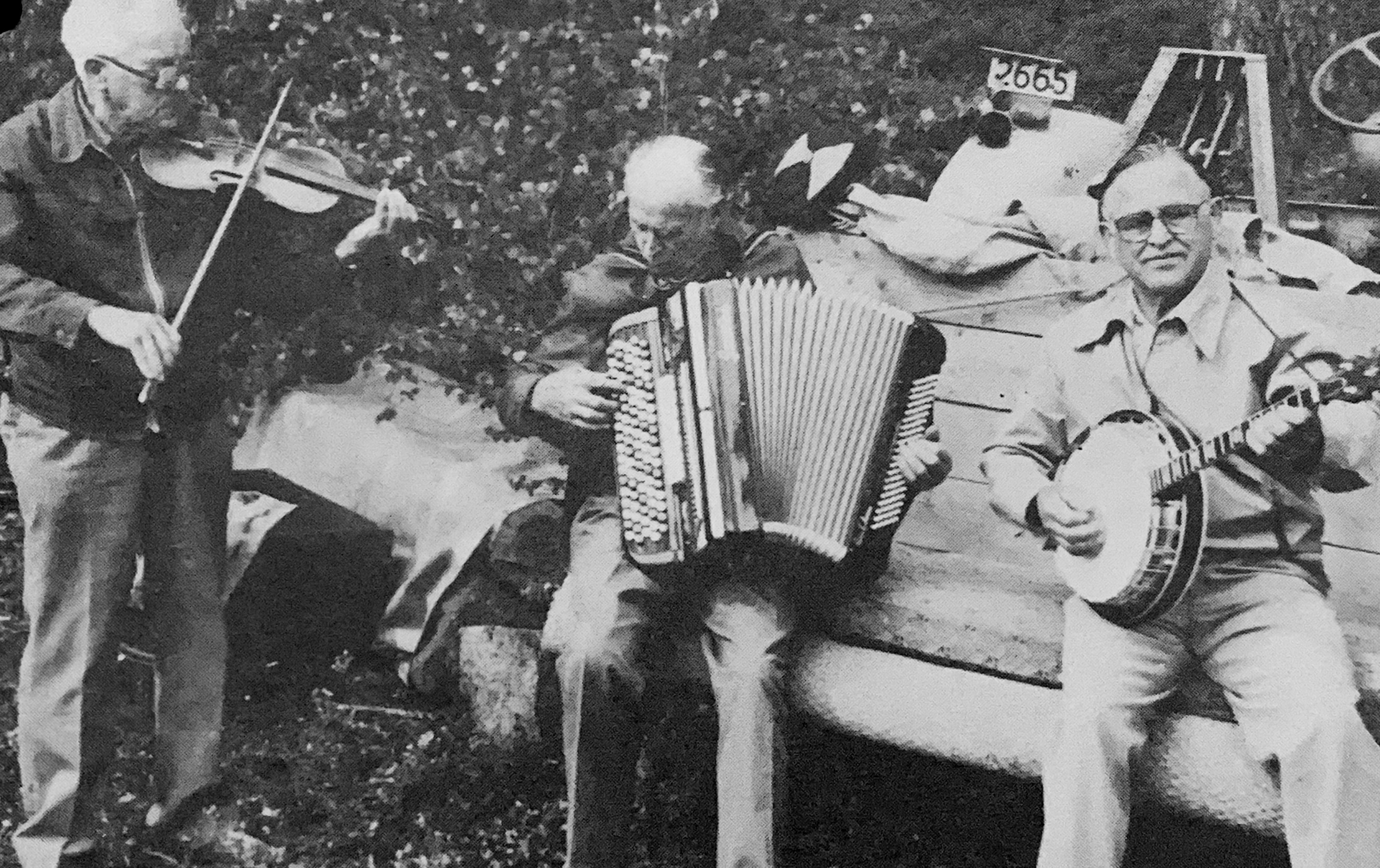 John Johnsrud var behjelpelig med transport under pensjonisforeningens utflukt. Sittende i skuffen fra venstre: Aud Beheim, Johs. Hagen, Marta Engeland. Bildet er tatt sommeren 1984.