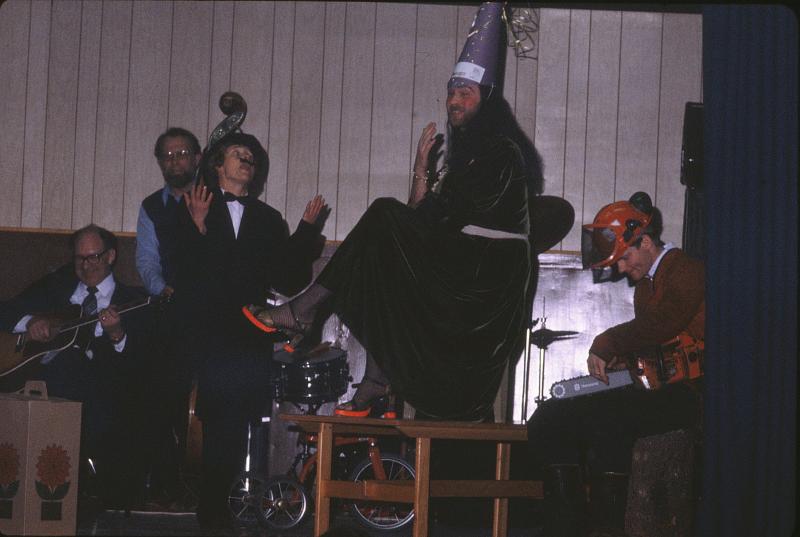 Fra jubileumsfesten med revy Ella Hindhamar og Terje Hindhamar. Jan Elgvang sitter med motorsaga og kom nok utilsiktet med på bildet.