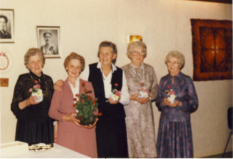 Fra 50-årsfesten på¨sanitetshuset i 1981. Konnerud sjømannsmisjon ble stiftet 23. november i 1931, Fra v: Ragnhild Thoresen (nesten 50 år som nestformann/formann), Gustava Wisting, Randi Aaserud (første formann), Ragnhild Amundsen og Ingrid Skramstad.