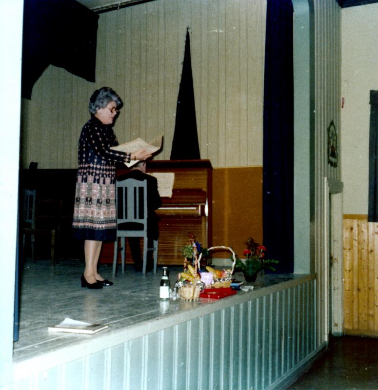Historielagets første medlemsmøte på Skogvang 27. Mars 1976. Gerd Eskerud underholdt med sang, akkompagnert av Markus Johnsrud på piano.