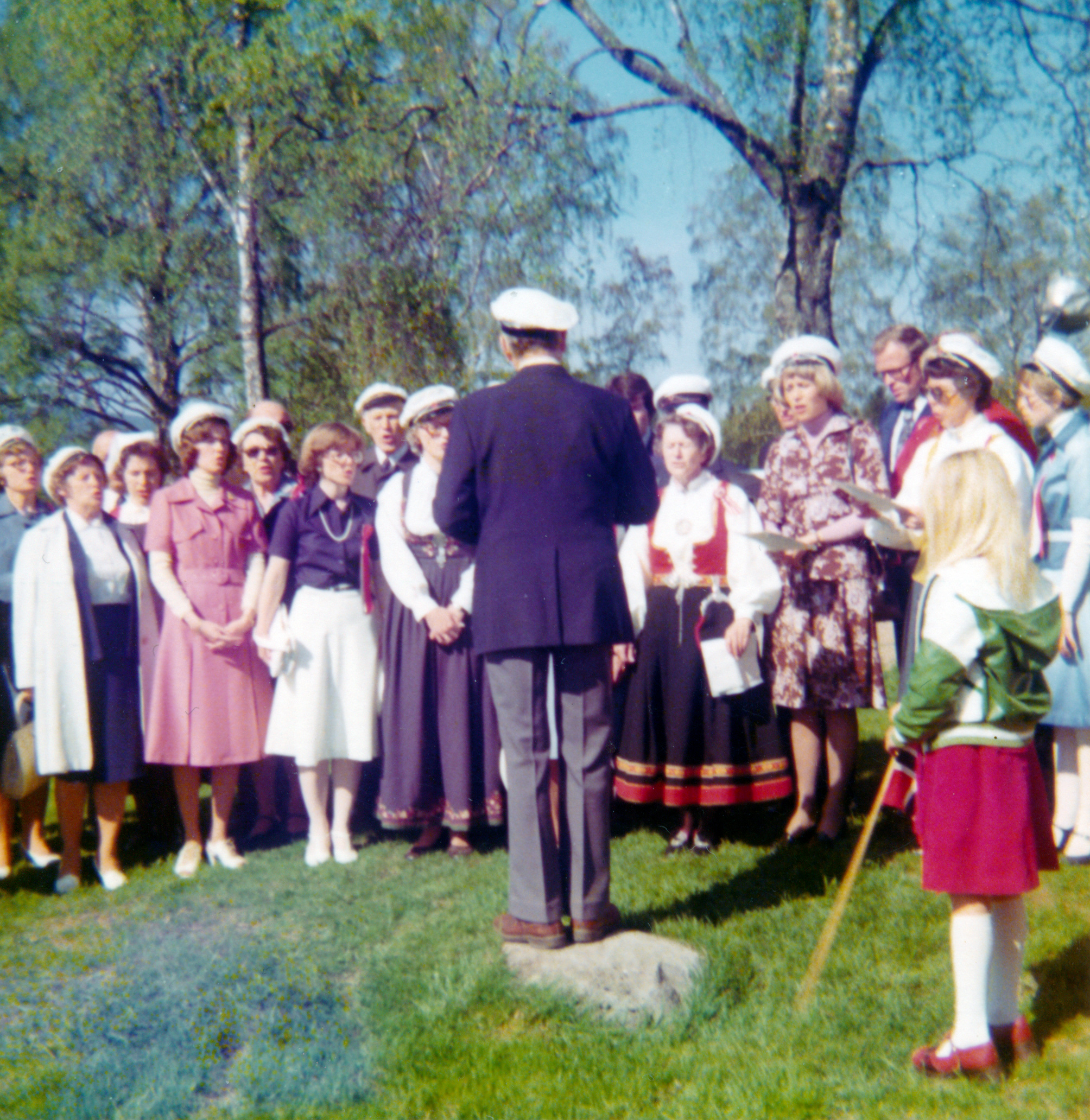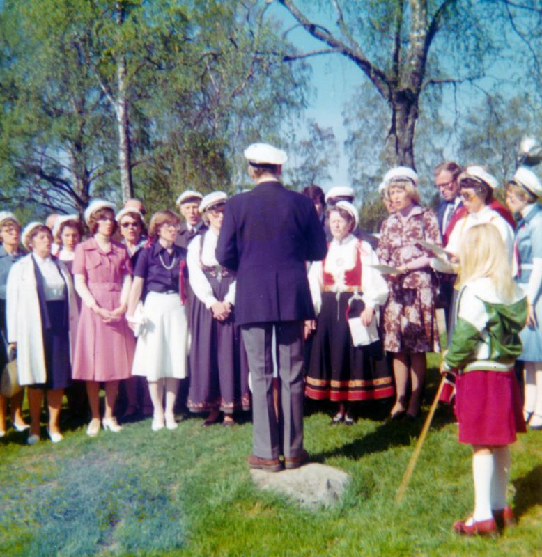 Skoger sangkor 17. mai 1975. Det er vanskelig å navngi alle, men noen kjennes igjen: Kirsten Steen, Ann Mari Steen, Randi Gundersen, Hans Steen og Karl (Kallemann) Knudsen.