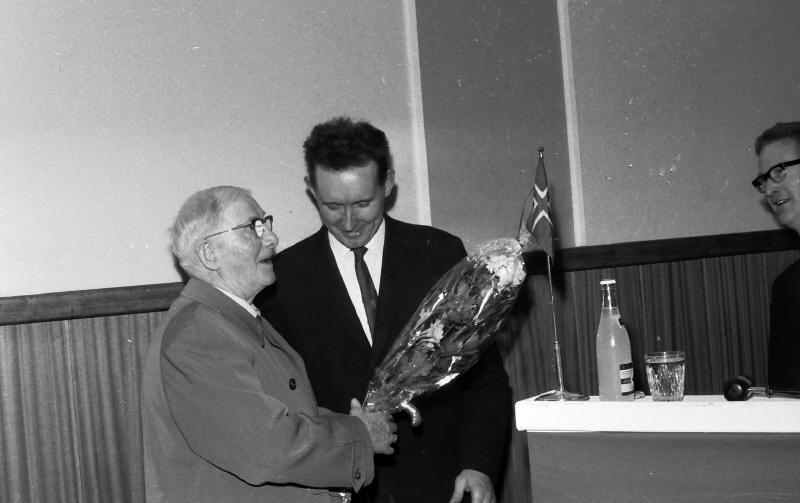 Henry Schwencke (1884-1976)blir overrakt blomster av Kjeld Jegh. Helt til høyre Normann Solberg.