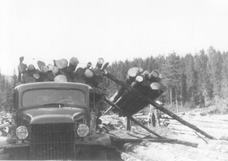 Isaksen lasteapperat er i bruk for å vinsje tømmret opp på lastebilen. Dette var til stor lettelse i arbeidet, for tidleger mått en håndtrille tømmret opp på bilen. Det kunne vere svert tongt. Sjåfør: Reidar Kristoffersen. Bilen er en GMC fra 2. verdenskrig. Takk til Asle Wang, Motorhistorissk Klubb Drammen, for opplysninger om bilen.