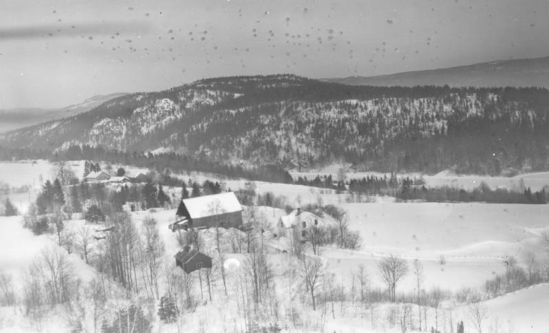 I forgrunnen Gunnerud midtre gnr. 31 bnr. 1 (Brattaas). I bakgrunnen Gjerpen søndre, gnr. 29 bnr. 2 (Juelsen). Dalen nedenfor, midt i bildet, er Kobbervikdalen. Helt i bakgrunnen ses åsen mot Solum og Nordbykollen.