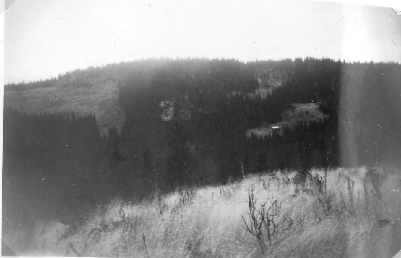 Terjevollen (Tørjevollen) sett fra Høgås. Huset som en kan se på bildet ble satt opp etter at alle husene ellers var bortre. Denne lille låven ble satt opp for å lagre høy fra vollen. Er nå også revet.(2013). Bildet er tatt i 1958 av Erik Grinderud.
