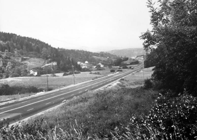 Bildet er fra 1957, dvs. kort tid etter at firefeltsveien i Kobbervikdalen var ferdig bygd. Den ble bygd i perioden 1953 - 1956. Dette var en av de aller første firefeltsveier i Norge utenom bymessige strøk. På Ås utenfor Tønsberg ligger Gamle Sande vegstasjon. Vegstasjonen består av en driftsbygning fra 1920-årene og en kontorfløy med brakker fra 1970-tallet. Bildet er funnet der av vårt medlem Tore H. Wiik som skriver bøker om "Riksveiene som ble til E18".