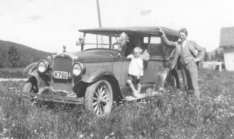 Johannes Johnsrud (d.y.) m/datter på besøk på Thorrud gård. Sønnesønn av Johannes Johnsrud (f.1867-d.1958) De hadde kjørt hele veien fra Kristiansand!! Bilen er en Oldsmobil, model ca. 1927, i 1930 registrert på dyrlege Chr. Johnsrud, Kristiansand. Takk til Asle Wang, Motorhistorisk Klubb Drammen, for opplysninger om bilen.