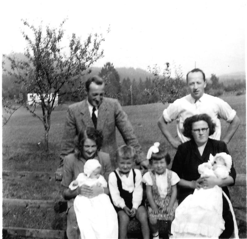 Barnedåp: Bak t.v. og ned: Øyvind Rustand, Ragnhild Rustand (f. Gomperud), Randi m/dåpskjole, Trond (bror til dåpsbarnet) Bak t.h. og ned: Olaf Rustand, Kari Rustand (f. Prøis), Jon m/dåpskjole, Liv (søster til dåpsbarnet) Barnedåpen ble holdt på Konnerud hvor de bodde Kari og Olaf Rustand bodde i 2.etg. hos Oskar Stubberud. Brødrene Olaf og Øyvind kommer fra en stor gård i Hof (Vestfold) Gårdens navn var RUSTAND.