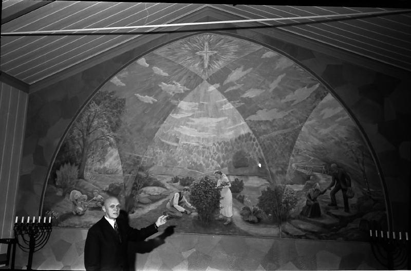 Bakveggen i kapellet er malt av Simen Horgen i 1953. "Fra vugge til grav". Simen Horgen vokste opp på Løse i Skoger. Han har også malt endeveggen i kapellet i Skoger. Se også bilde med ID 5477 Her er det sokneprest A. K. Torgersen som står foran maleriet. Han var prest i Skoger fra 1971 til 1980.