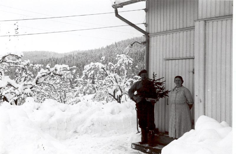 Tekst: Torill Juel Søskenparet Martha (1898-1979) og Thomas Løkka (1889- 1971) bodde i Løkka. Fotografen, Arne Belsaas, har levert juletre. Arne Belsaas arbeidet i Selvik bruk. Thomas var skogsarbeider i "Bruket" i 50 år.