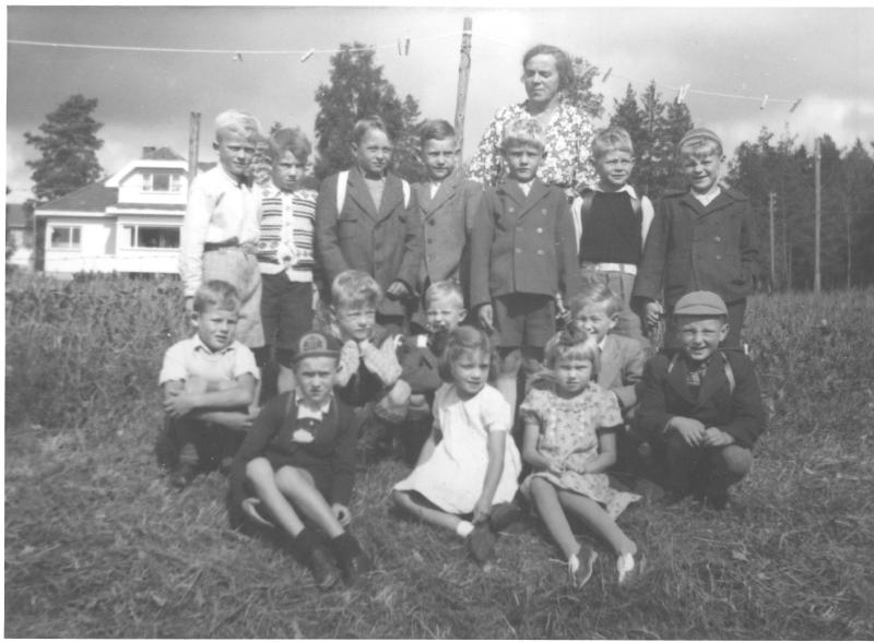 Fra venstre bak: Sående helt bakerst: Lærerinne Margit Brattås Stående foran henne: Karl Johan (Kalle) Knudsen, Arild Johansen, Jan Hagen, Oddvar Hansen, Tore Hoven, Dag Boman, Terje Sandbeck Sittende foran fra venstre: ukjent gutt, Einar Johansen, Asbjørn Tørvi, ukjent gutt, Astrid Grøtterud, ukjent jente, John Johnsrud, Kristian Tjugum