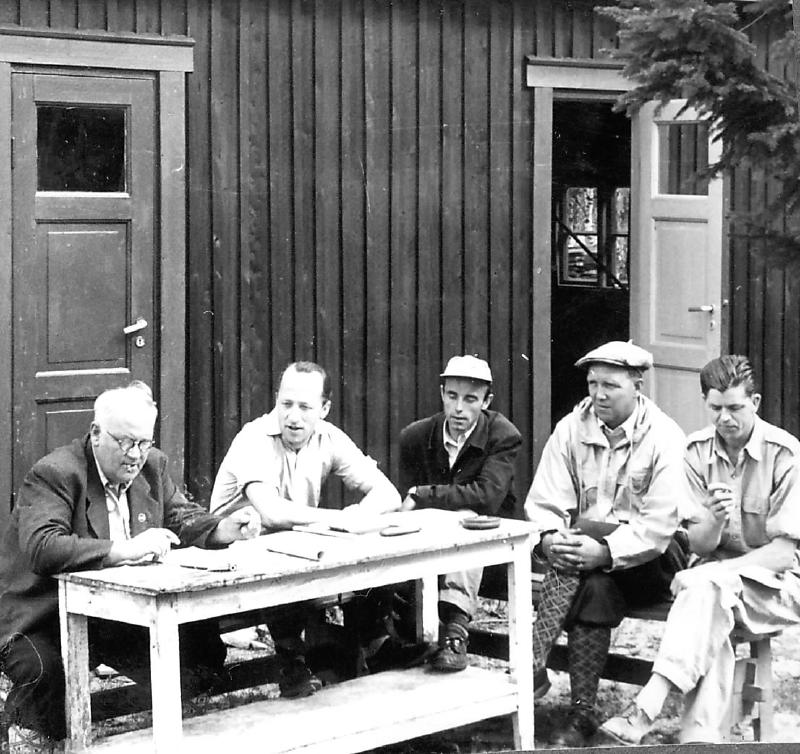 Tekst: Torill Juel Toppledelsen i KIL hadde møte foran det første klubbhuset som var ferdig i 1947. (Et lite tilbygg i 1952. Det besto av 2 garderober. (for borte- og hjemmelag). Første byggetrinn i nåværende klubbhus kom i 1957 og ble påbygd fler ganger siden. Her er banekomiteen : Fra venstre: Axel M Amundsen (1899-1970), Olaf Rustand, Arne Berntzen (1920-1996), Harald Wisting (1909-1988) og Olaf Nilsen (1922-2004)