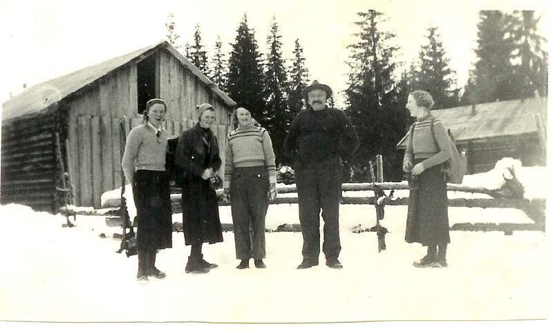 Fire unge damer på besøk hos Hindenburg (kallenavn) på Heia innenfor Majordammen ca. 1938. Hans egentlige navn var Anders Johansson. Se også Historielagsnytt 1/2016 side 26. Vi er noe usikre på navnet på damene, men hun helt til høyre vet vi er Gjertrud Beheim (med kallenavn Tulla) som bl.a. drev kafeteriaen på busstasjonen (SH-busslinjer) på Grønland i Drammen i mange år.