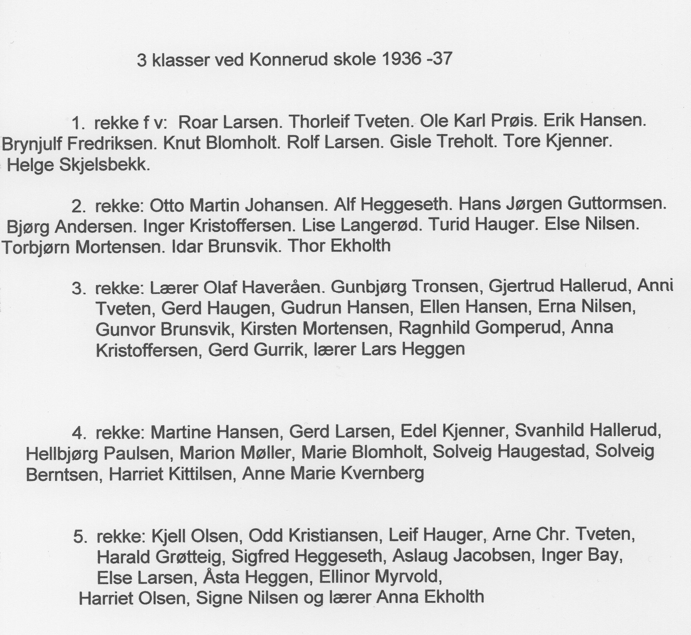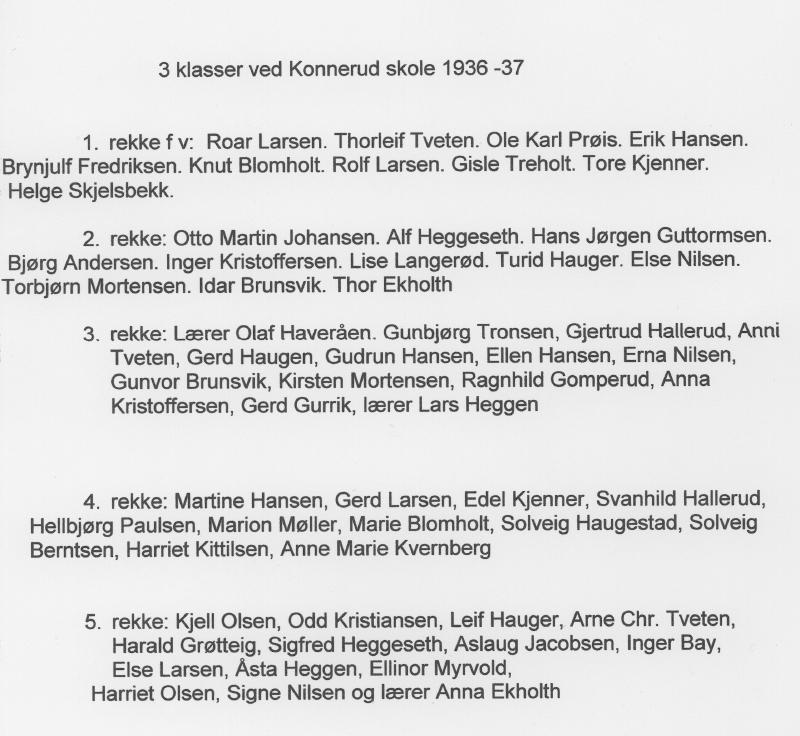 3 klasser ved Konnerud skole 1936-37 1. rekke f v: Roar Larsen. Thorleif Tveten. Ole Karl Prøis. Erik Hansen. Brynjulf Fredriksen. Knut Blomholt. Rolf Larsen. Gisle Treholt. Tore Kjenner. Helge Skjelsbekk. 2. rekke: Otto Martin Johansen. Alf Heggeseth. Hans Jørgen Guttormsen. Bjørg Andersen. Inger Kristoffersen. Lise Langerød. Turid Hauger. Else Nilsen. Torbjørn Mortensen. Idar Brunsvik. Thor Ekholth 3. rekke: Lærer Olaf Haveråen. Gunbjørg Tronsen, Gjertrud Hallerud, Anni Tveten, Gerd Haugen, Gudrun Hansen, Ellen Hansen, Ema Nilsen, Gunvor Brunsvik, Kirsten Mortensen, Ragnhild Gomperud, Anna Kristoffersen, Gerd Gurrik, lærer Lars Heggen 4. rekke: Martine Hansen, Gerd Larsen, Edel Kjenner, Svanhild Hallerud, Hellbjørg Paulsen, Marion Møller, Marie Blomholt, Solveig Haugestad, Solveig Berntsen, Harriet Kittilsen, Anne Marie Kvemberg 5. rekke: Kjell Olsen, Odd Kristiansen, Leif Hauger, Ame Chr. Tveten, Harald Grøtteig, Sigfred Heggeseth, Aslaug Jacobsen, Inger Bay, Else Larsen, Åsta Heggen, Ellinor Myrvold, Harriet Olsen, Signe Nilsen og lærer Anna Ekholth