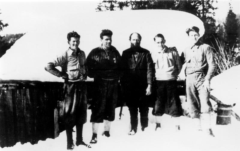 Hytta til Andreas Ellefsen Dammyr. Fra v, Gudbrand Horgen, Harald Haveråen, Andreas Ellefsen Dammyr, Johan Haveråen, Simen Horgen