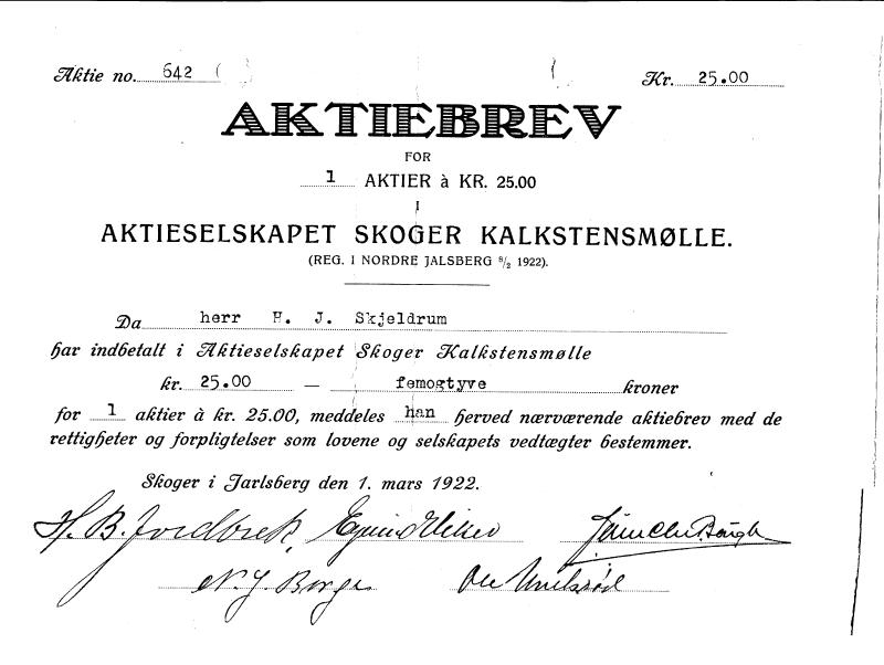 Aksjebrev i Skoger Kalkstensmølle som lå ved siden av (mot vest) der Skjeldrumsaga nå ligger. Motoren fra kalkstensmølla ble brukt som motor for saga etter flyttingen av saga.